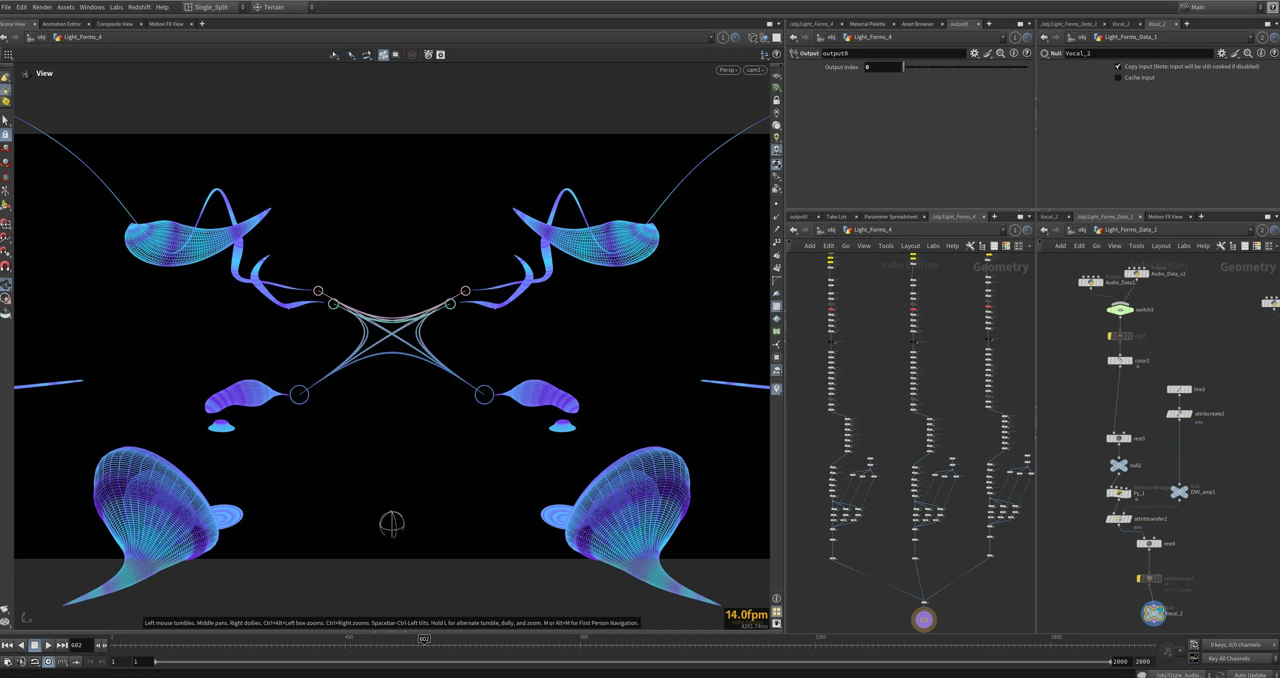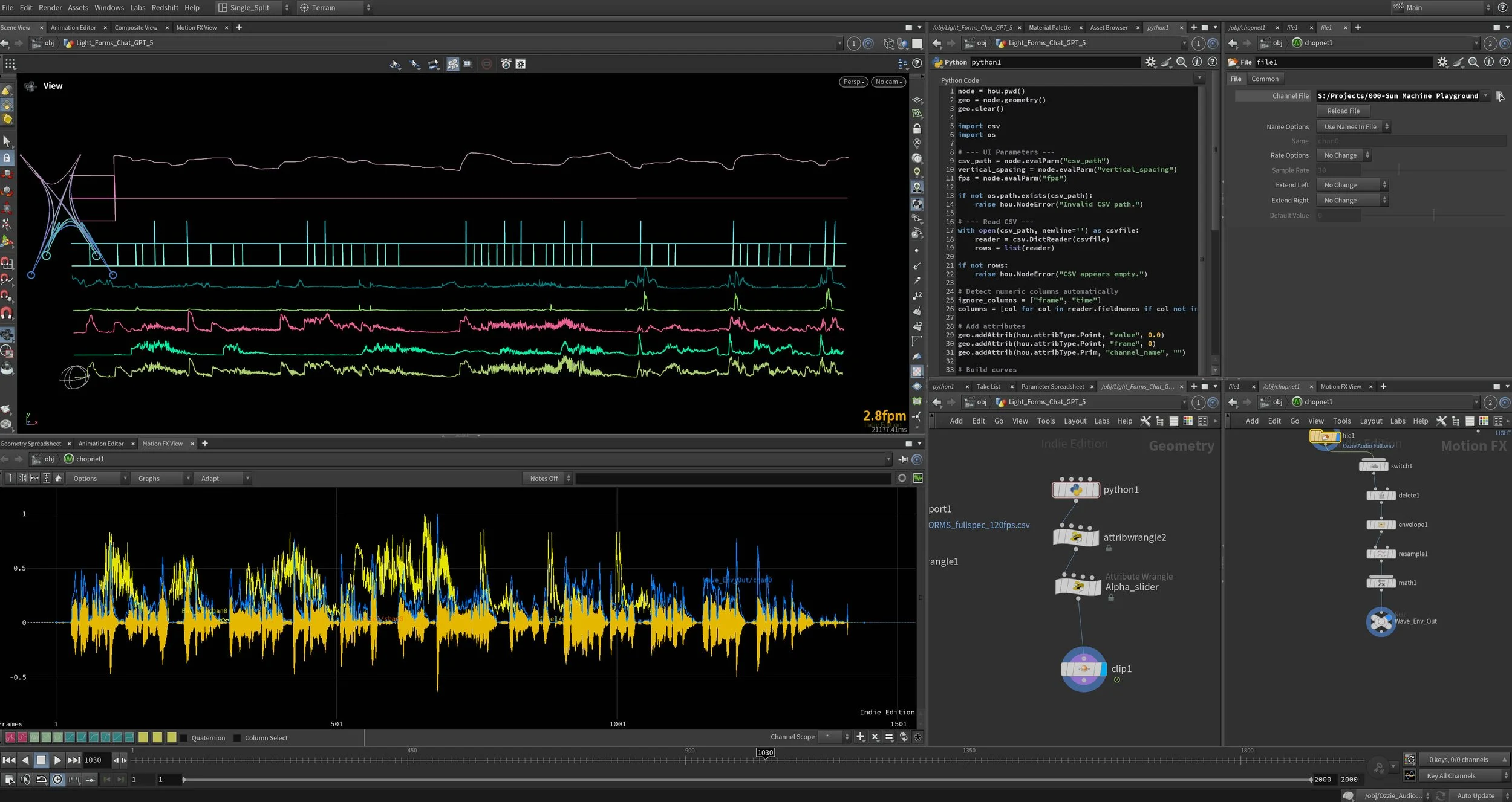 The Tony data was loaded into Houdini and some more basic audio analysis was done in CHOPS.